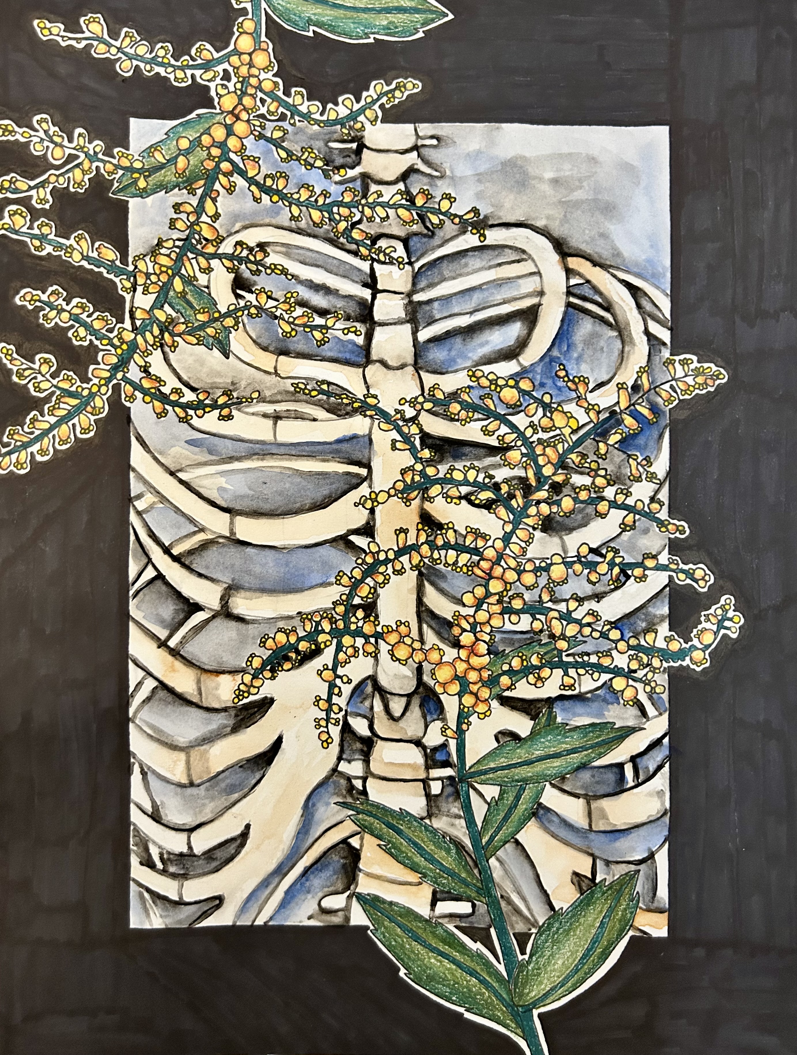 Windham Peak, 2023, acrylic and rhinestonesThistle, 2023, watercolor, ink, and colored pencilHome (detail), 2019, ink and acrylic